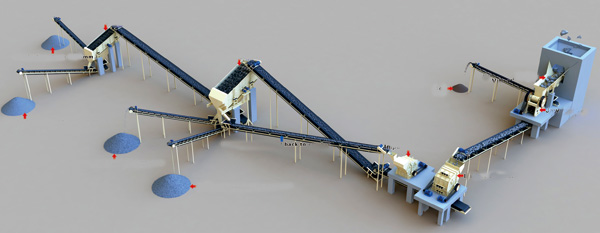 首先,骨料由給料機均勻地送進顎式破碎機進行初步破碎,然后,產(chǎn)成的粗料由輸送機輸送至反擊式破碎機進行進一步破碎,細碎后的骨料進振動篩篩分出不同規(guī)格的石子,不滿足粒度要求的骨料返料進反擊式破碎機再次破碎,最終達到所需產(chǎn)品。